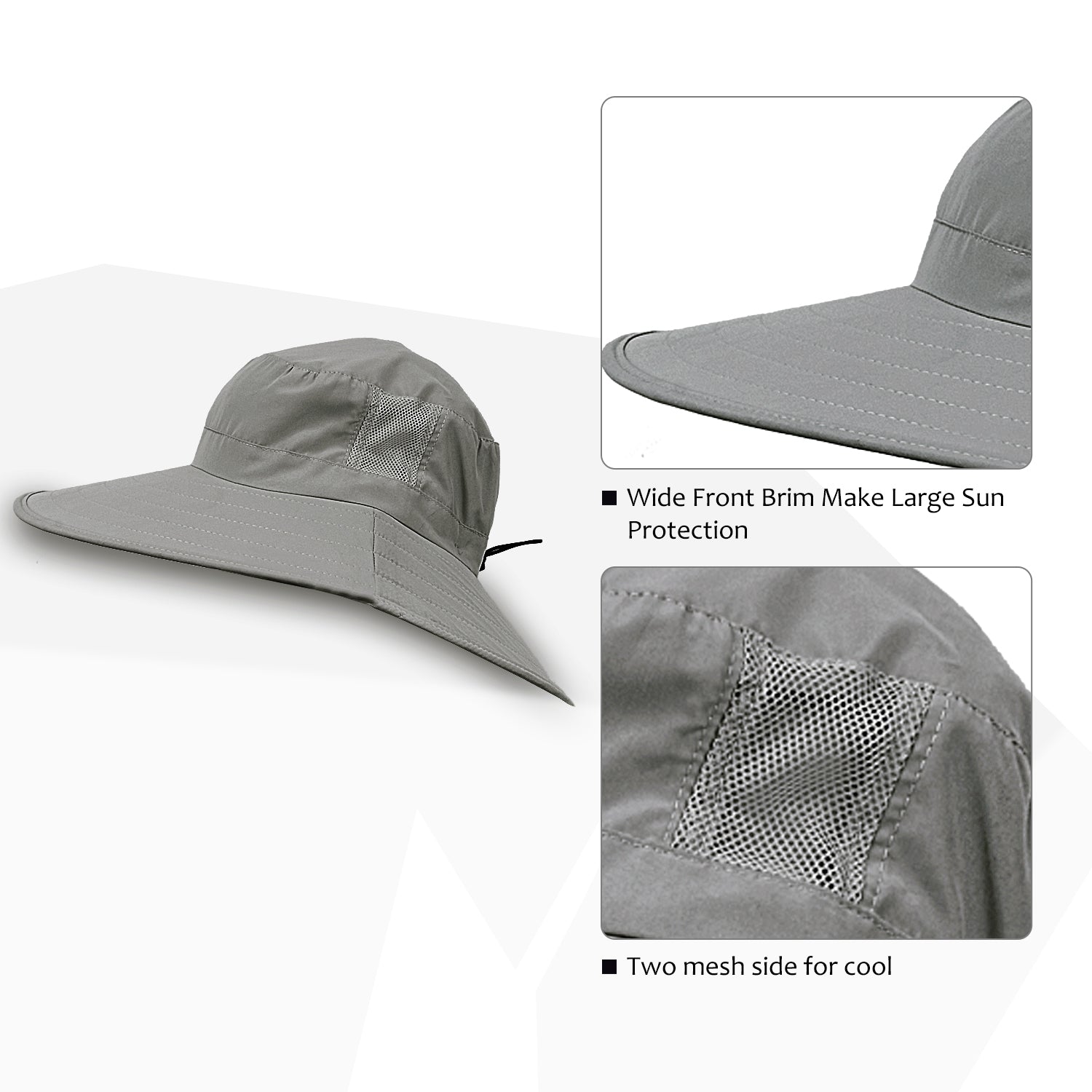 Unisex sun hat fits small head size for most men and women: head circumference 23 3/4 inches; 3.6" side brim and 4.7" front and back brim stay stiff. Rear adjustable drawstring make proper fit for your head.