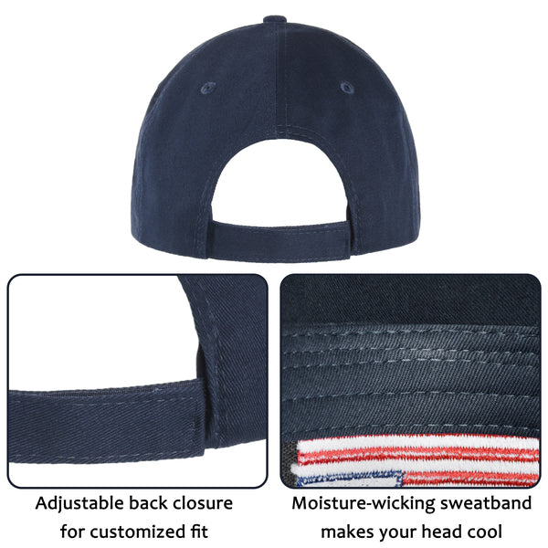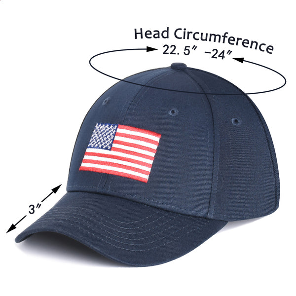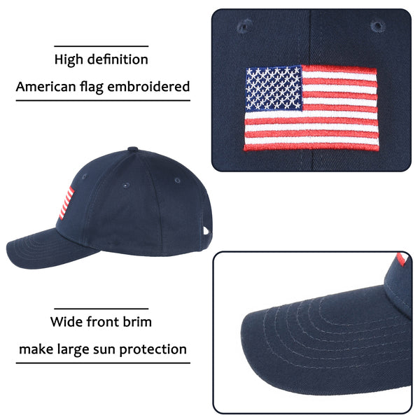 This USA flag embroidered patch baseball cap with 6 rows of stitches on the bill, and 4 needle moisture-wicking sweatbands make your head cool in sunny with solid sunshine. No size restrictions and it is suitable for all genders and ages.