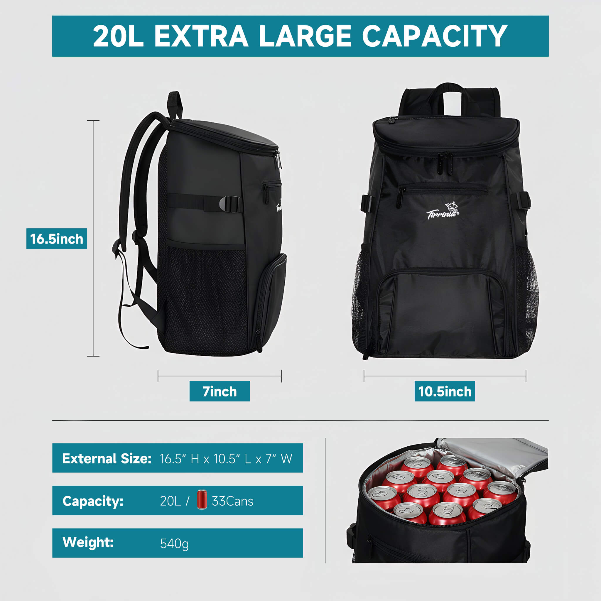 With dimensions of 16.5" x 10.5" x 7", this spacious 20L cooler backpack can hold up to 33 cans of your favorite beverages. Despite its large capacity, the backpack weighs only 1.2 lbs (540g), making it lightweight and easy to carry for picnics, beach trips, and outdoor activities.