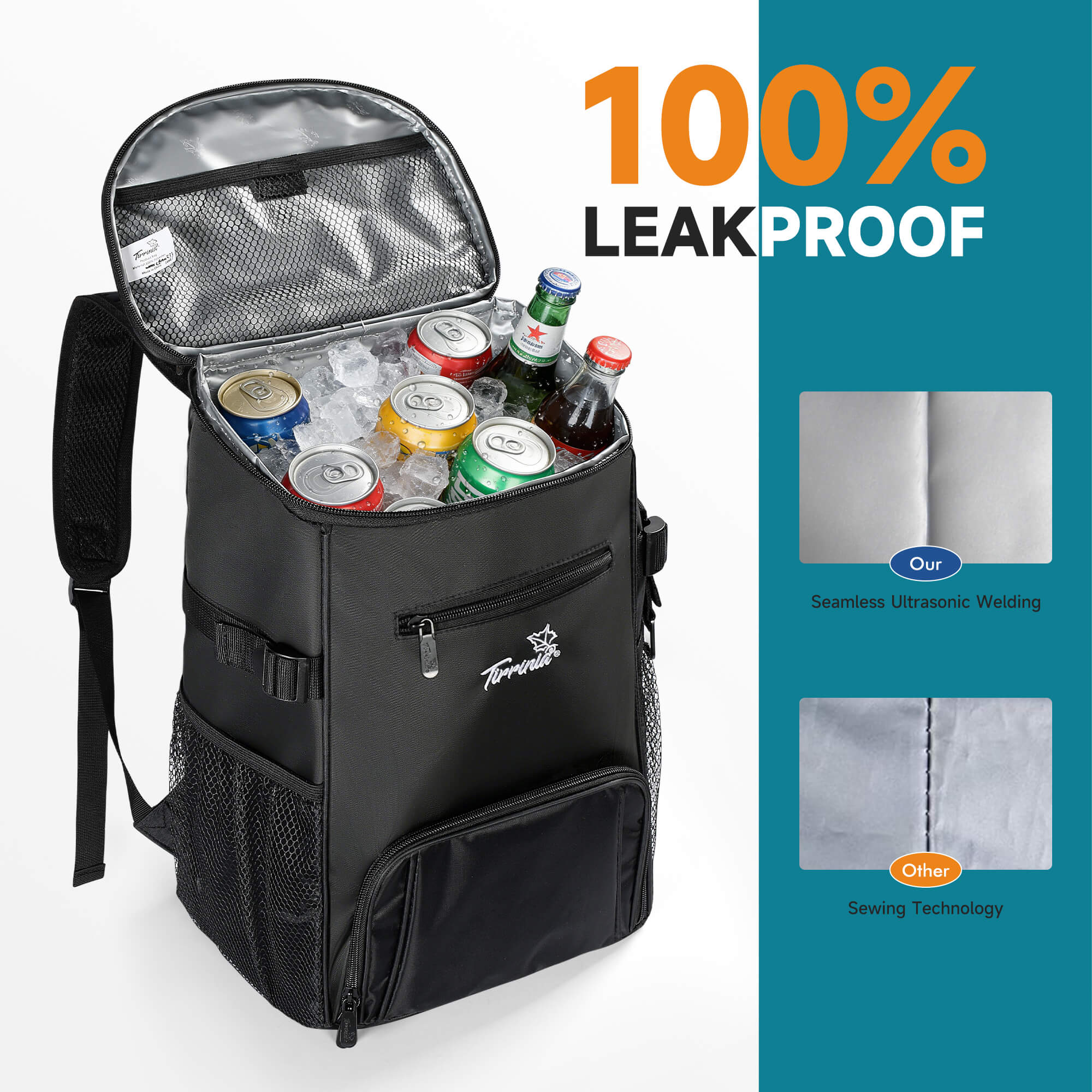 Say goodbye to messy leaks. Unlike traditional sewn liners, this cooler backpack features advanced seamless ultrasonic welding technology that creates a completely leakproof interior. You can place ice directly inside without worrying about water leaking onto your clothes, car seats, or other belongings. The smooth liner is also easy to wipe clean after use.