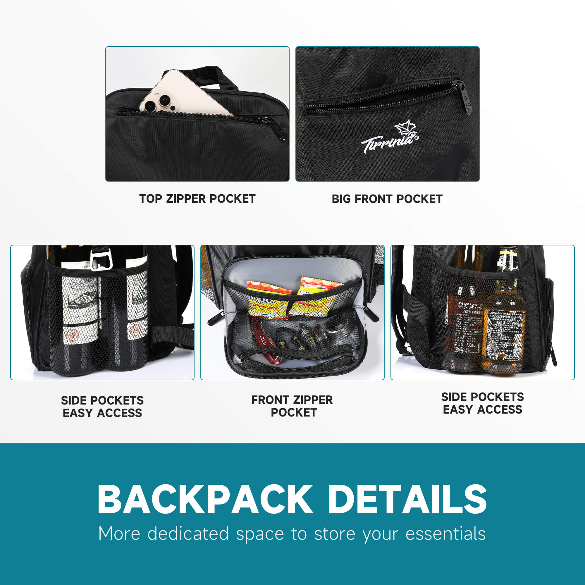 Stay organized wherever you go. This insulated backpack cooler features a large main compartment plus several additional storage pockets, including a top zipper pocket for your phone, a front pocket for snacks and utensils, and two side mesh pockets for water bottles, wine, or umbrellas.