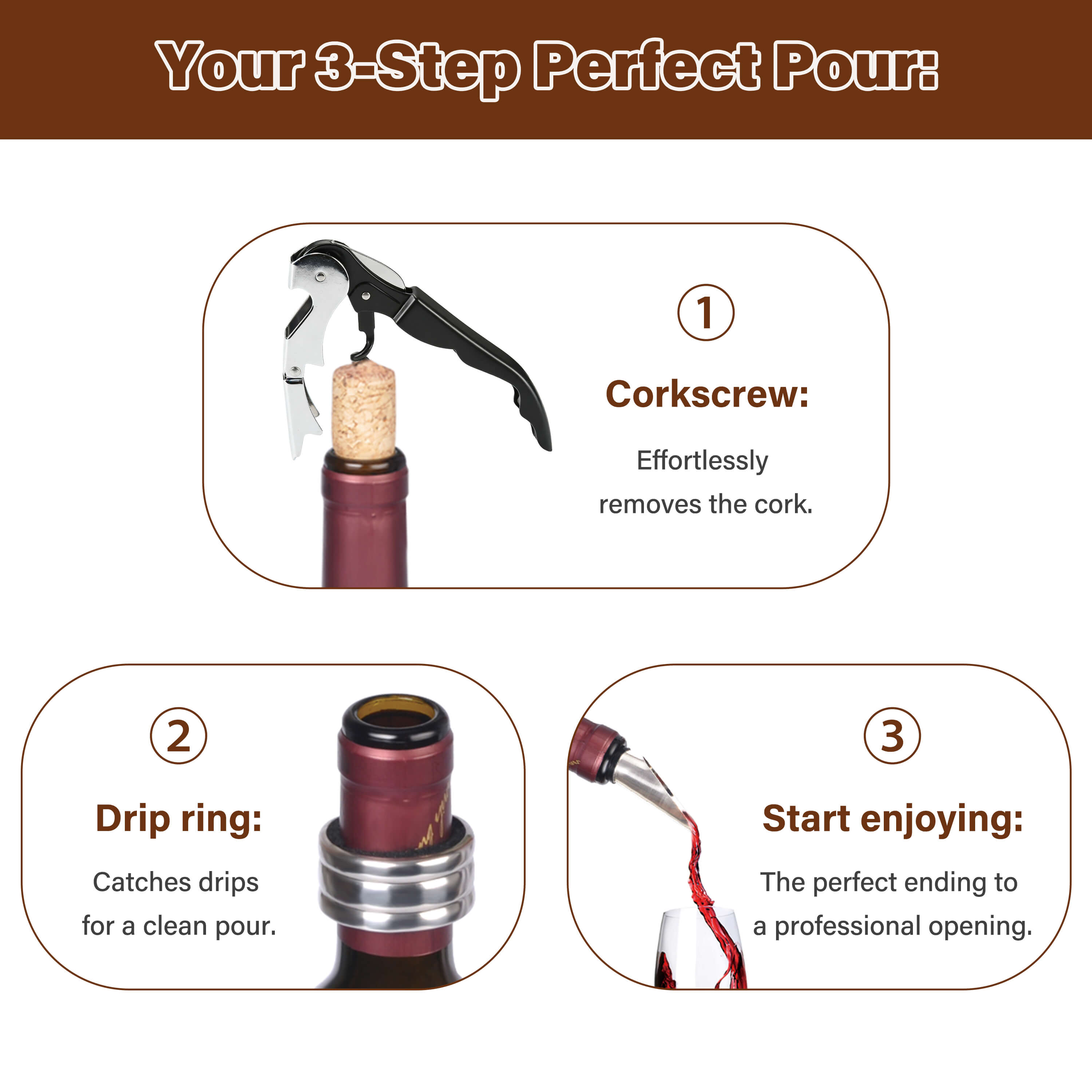 Each tool is designed to make opening, pouring, and serving wine simple and mess-free.