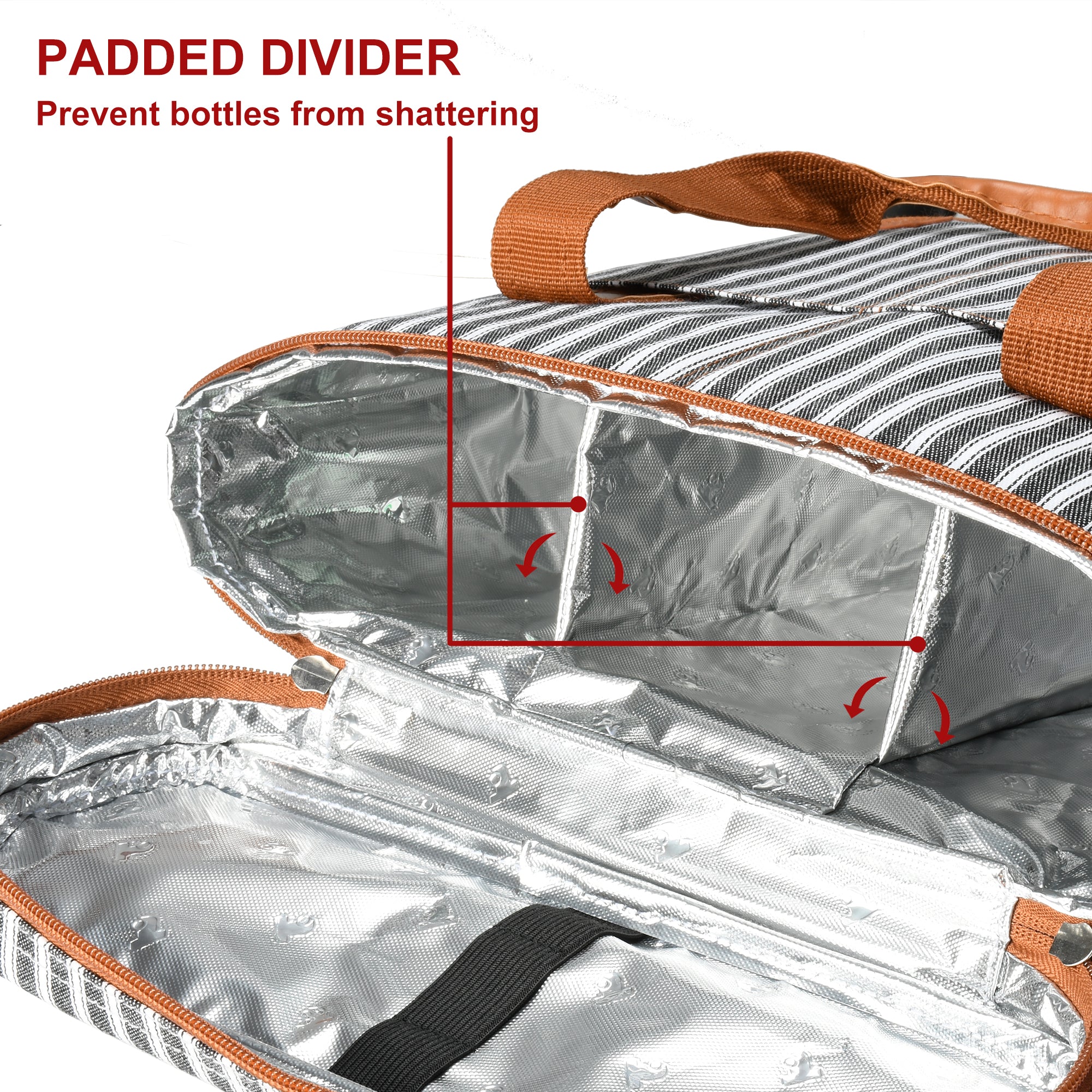 The sturdy handle, adjustable shoulder strap, and stainless steel buckle of this wine cooler bag help you carry your wine anywhere. Tirrinia wine carrier is lightweight, durable, and insulated. It is made elaborately of durable 600D Polyester, insulated with PU material which is easy to clean and keeps the temperature cool for hours. It's also removable, you can use the wine bag as an insulated cooler bag and enjoy wines with your friends or families.